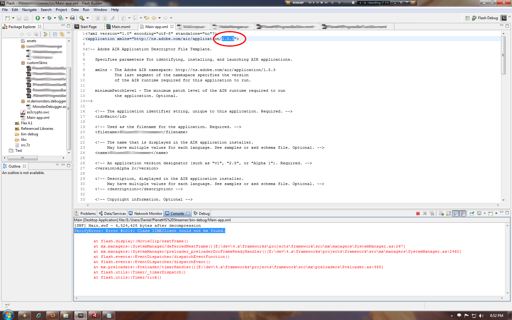 You may be wondering what it means, and more importantly how to fix it. What appears to be the sole cause of this error is your versions not matching up between your Flex/AIR SDK and the AIR application descriptor file. This can happen after you update/reinstall Flash Builder, or the SDK folder manually.
